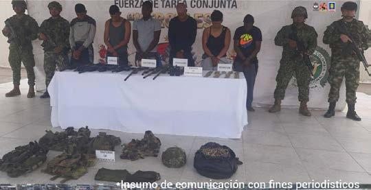 Apoyados por soldados del Ejército Nacional, los infantes llegaron a una vivienda cons truida sobre palafitos en donde se habían refugiado los sujetos, quienes portaban cinco fusiles R-15 que lanzaron al suelo para luego salir por la puerta trasera del inmueble donde fueron cap turados.