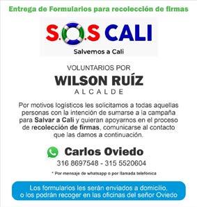 de apoyo recibidos. Wilson Ruiz, expresó su agradecimiento a la comunidad por el gi gantesco respaldo y re cordó que su aspiración obedece a la solicitud de los propios habitantes del oriente de la ciudad donde consideran que es el líder idóneo para enderezar el rumbo de la capital vallecaucana. El proceso de reco lección de las firmas es coordinado por el abogado Carlos Arturo Oviedo, especialista en esas actividades y quien señaló que muy pronto serán recogidas las fir mas necesarias para la inscripción de la candi datura popular y cívica de Wilson Ruiz Orejue la.