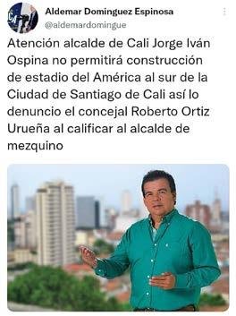 pina: “El América de Cali puede tener su estadio propio, pero el alcalde Ospina parece que no lo quiere permitir, comen zó a sabotear la idea. No olvidemos que con la plata que le ha metido al estadio Pascual Guerre ro en su remodelación, se podían haber hechos 2 estadios nuevos...”