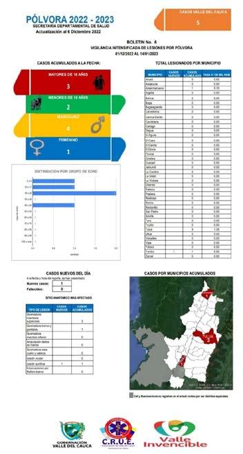 A la fecha, de acuerdo con la vigilancia intensificada de le siones por pólvora que realiza la Secretaría departamental de Salud en 40 municipios, excep tuando los distritos especiales de Cali y Buenaventura, se han registrado en total cinco casos de lesionados, entre ellos tres mayores de edad y dos niños en los municipios de Tuluá, Anser manuevo y Yumbo.