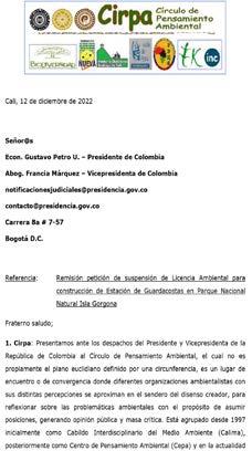 El Círculo de Pensamiento ambiental CIRPA que dirige el abogado Armando Palau Aldana, solicitó mediante solicitud de petición al presidente Gustavo Petro la suspensión inmediata de la licencia ambiental para la construcción de una base militar en la Isla Gorgona.