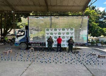 Las otras dos diligencias de registro y allanamientos fueron a dos establecimientos comerciales en el barrio Las Delicias del municipio de Palmira, donde se logra la captura en flagrancia de dos hombres de 38 y 44 años de edad, la incautación de 1.188 Botellas en vidrio transparente con tapa roja, en presentación de 750 ml, 1.920 Canecas en vidrio transparente con tapa azul y roja, en presentación de 375 ml y 246 Garrafas en vidrio transparente con tapa