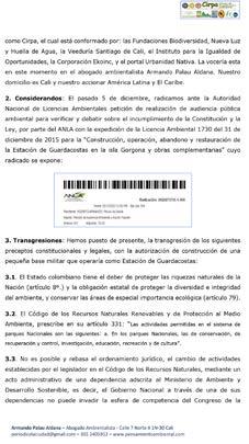 En la misiva el reconocido dirigente ambientalista señala: “Sabiendo que no fue el actual gobierno nacional el que expidió la Licencia 1730 de 2015 para la “Construcción y operación de la Estación de Guardacostas en la isla Gorgona” que contiene un Plan de Compensación por pérdida de Biodiversidad; no sería consecuente con los destacados discursos de quien se posiciona como líder ambiental del mundo, que se permita su desarrollo y/o ejecución al ponerse de presente que este permiso de intervención y cambio de uso del suelo del Parque Nacional Natural Isla Gorgona transgrede los citados preceptos y lesiona los atributos de este frágil bioma, a saber: 381 especies de peces, 155 especies de aves, 35 de reptiles, 7 de anfibios y 430 tipos de plantas con flores, de las cuales el 4 % son endémicas. Además, contiene uno de los arrecifes coralinos más desarrollados y únicos del Pacífico Oriental Tropical y más extensos del Pacífico colombiano. Gorgona y Gorgonilla hacen parte de la ruta de las míticas ballenas Yubarta y de legiones de delfines.
