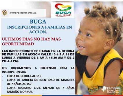 El enlace Municipal del programa Familias en Acción James Buitrago, informa a los bugueños que hasta el próximo jueves 29 de diciembre se estarán realizando inscripciones al programa en la calle 13ª # 9ª-11, en el horario de 8:00 a.m. a 12:00 m. y de 2:00 p.m. a 4:00 p.m.