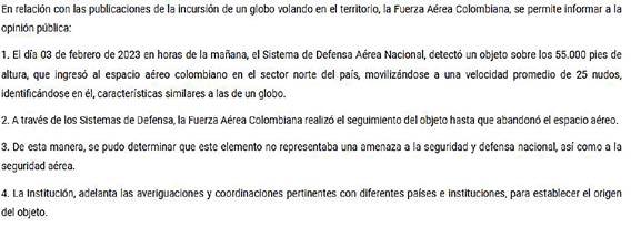 La Fuerza Aérea confirmó que el pasado viernes se detectó que un objeto no identificado estaba invadiendo el espacio aéreo nacional. “El día 3 de febrero de 2023 en horas de la mañana, el Sistema de Defensa Aérea Nacional, detectó un objeto sobre los 55.000 pies de altura, que ingresó al espacio aéreo colombiano en el sector norte del país, movilizándose a una velocidad promedio de 25 nudos, identificándose en él, características similares a las de un globo”, señaló la autoridad aérea.
