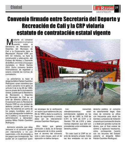 ediante un convenio i n te r a d m i n i s t r a t i vo suscrito entre la Secretaría de Recreación y Deportes del Municipio de Cali y la Corporación para la Recreación Popular CRP, por $10 mil millones, se hará la construcción y adecuación del Coliseo de Hockey y Diamante de Softbol, con miras a los juegos mundiales o World Games 2013. Dicho convenio tendría inconsistencia de legalidad y estaría violando las normas de contratación. La advertencia la hace el dirigente Milton Fabián Castrillon Rodríguez, quien considera que a dicho convenio no le aplica el artículo 5 de la ley 80 de 1.993, que es propia de la contratación estatal, puesto que la Secretaría de Recreación y Deportes del Municipio de Cali es un ente de derecho público y la Corporación para la Recreación Popular CRP, es una entidad de derecho privado sin ánimo de lucro. “No estamos en contra de los juegos mundiales, pero si hay que salvaguardar la defensa de lo público y no exponer a la administración a demandas”, preciso Milton Fabián Castrillon Rodríguez. Asimismo advierte, que debe revisarse si el convenio quedó con interventoria y no con supervisión, a fin de proceder a los pagos que corresponda. “No puede ser un supervisor quien