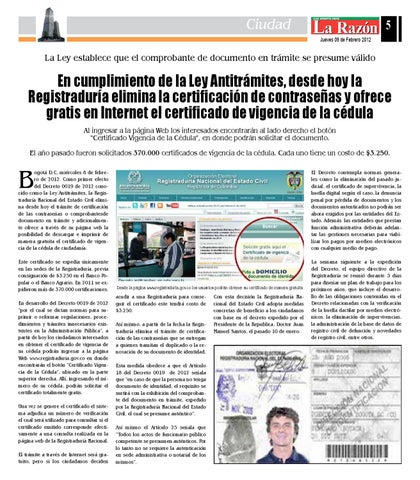 ogotá D.C, miércoles 8 de febrero de 2012. Como primer efecto del Decreto 0019 de 2012 conocido como la Ley Antitrámites, la Registraduría Nacional del Estado Civil elimina desde hoy el trámite de certificación de las contraseñas o comprobantesde documento en trámite y adicionalmente ofrece a través de su página web la posibilidad de descargar e imprimir de manera gratuita el certificado de vigencia de la cédula de ciudadanía.
