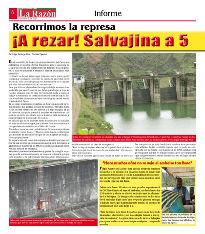 n el municipio de Suarez en el departamento del Cauca sus habitantes no pueden dormir tranquilos ante la amenaza de la apertura de las tres compuertas del Embalse de La Salvajina, el cual se encuentra a escasos 5 metros del máximo tope permitido. El Diario La Razón estuvo ayer miércoles en la zona y pudo comprobar mediante recorrido en lancha la gravedad de la situación. Toda la madrugada llovió fuertemente en la represa y el nivel del embalse subió 40 centímetros. Para que el lector dimensione la magnitud de la amenaza basta decirle que esos 5 metros que faltan para llegar al tope se pueden alcanzar con 20 días de torrencial lluvia y según el IDEAM el fenómeno de la Niña irá hasta el mes de marzo. Sobre el embalse desembocan siete ríos de gran caudal siendo el principal el Cauca. Ya se están organizando rogativas en Suárez para pedir al todopoderoso que amaine la furia del invierno. Salvajina hasta el día de ayer estaba en 148 metros y el tope máximo es de 153 metros. En época normal el embalse se mantiene en 115 metros, es decir que desde que el invierno está azotando al país Salvajina ha aumentado 33 metros. Se calcula que en el embalse están acumulados 93 millones de metros cúbicos de agua, los cuales se liberarse ocasionaría una gravísima inundación en el Valle del Cauca. El máximo temor es para los habitantes de las zonas próximas al embalse como Suárez y Buenos Aires Cauca, poblaciones que sufrirían de inmediato el rigor de una tragedia de incalculables proporciones. En la parte alta del muro del embalse se instaló una base militar la cual monitorea permanentemente el nivel del mismo al igual que los ingenieros de EPSA y la empresa española Unión Fenosa, dueños de Salvajina. Así mismo pescadores artesanales y gentes de la región montan guardia permanentemente de manera voluntaria porque ni la alcaldía, ni la gobernación del Cauca han diseñado pla-