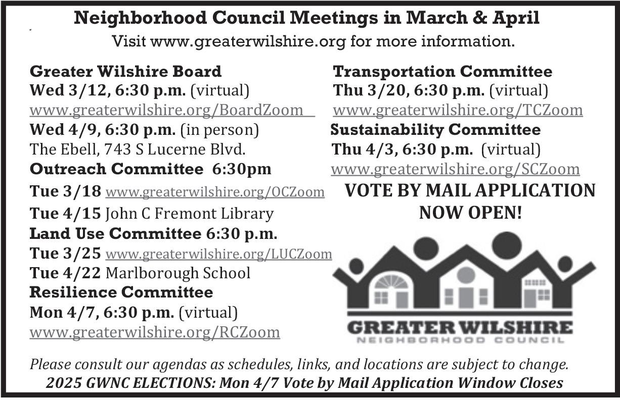 Wed., March 12 — Greater Wilshire Neighborhood Council board meeting via Zoom at 6:30 p.m., greaterwilshire.org.