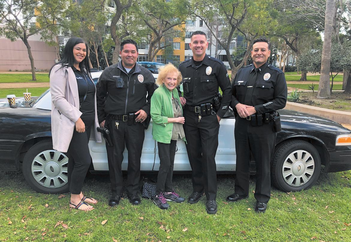 PARK LA BREA resident Claire Mintz is surrounded by (from left) Dora Magana from Park La Brea’s security patrol and Officers Hector Marquez, Andrew Jones and Michael Soliman.