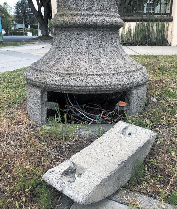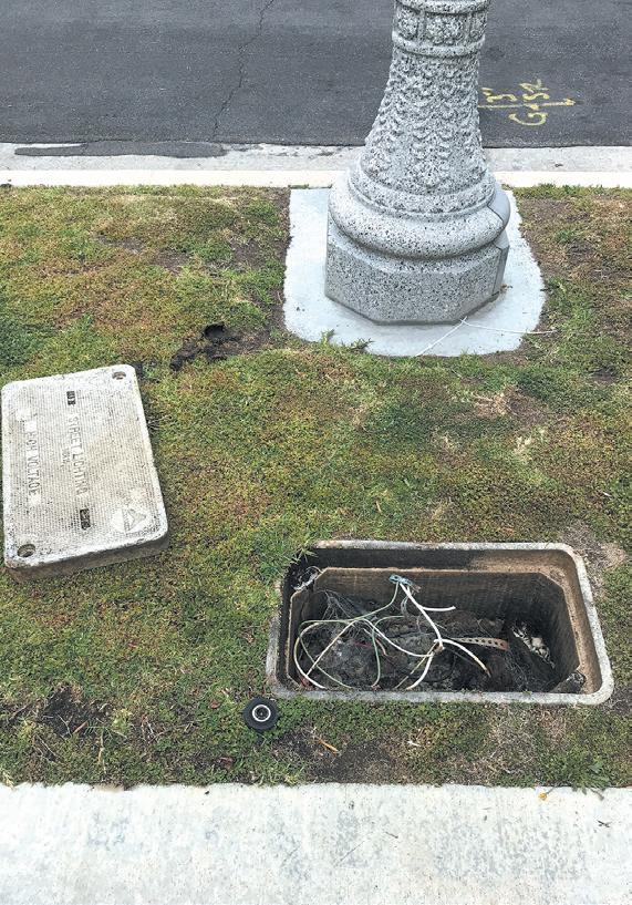 well as pictures of the vandalized light poles and their junction boxes, from which the wires emanate to power the bulbs above.