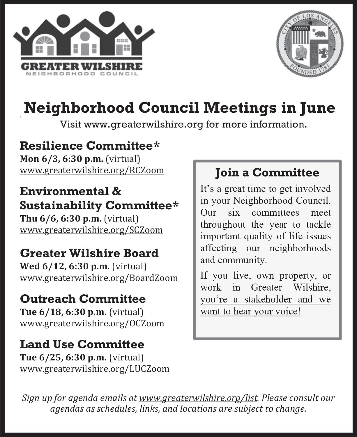 Wed., June 12 — Greater Wilshire Neighborhood Council board meeting, 6:30 p.m. at the Ebell of Los Angeles, 743 S. Lucerne Blvd., greaterwilshire.org.
