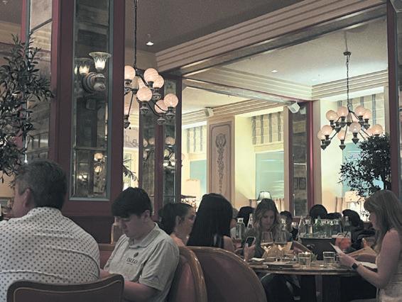 ly elegant, with plush pink banquettes, regular table seating, bar seating, antiqued mirrors inlaid in wooden columns, large bistro chandeliers with multiple arms with charming round bulbs, and a scattering of greenery. The service is exceptional; professional and attentive without being stuffy. Servers wear crisp white jackets, fill water glasses promptly, and fold napkins neatly when a guest gets up from the table. It’s a white tablecloth restaurant without any white tablecloths. We felt pampered. My husband and I had wanted a special dinner for us and our daughter, who was visiting from New York, and we got one.