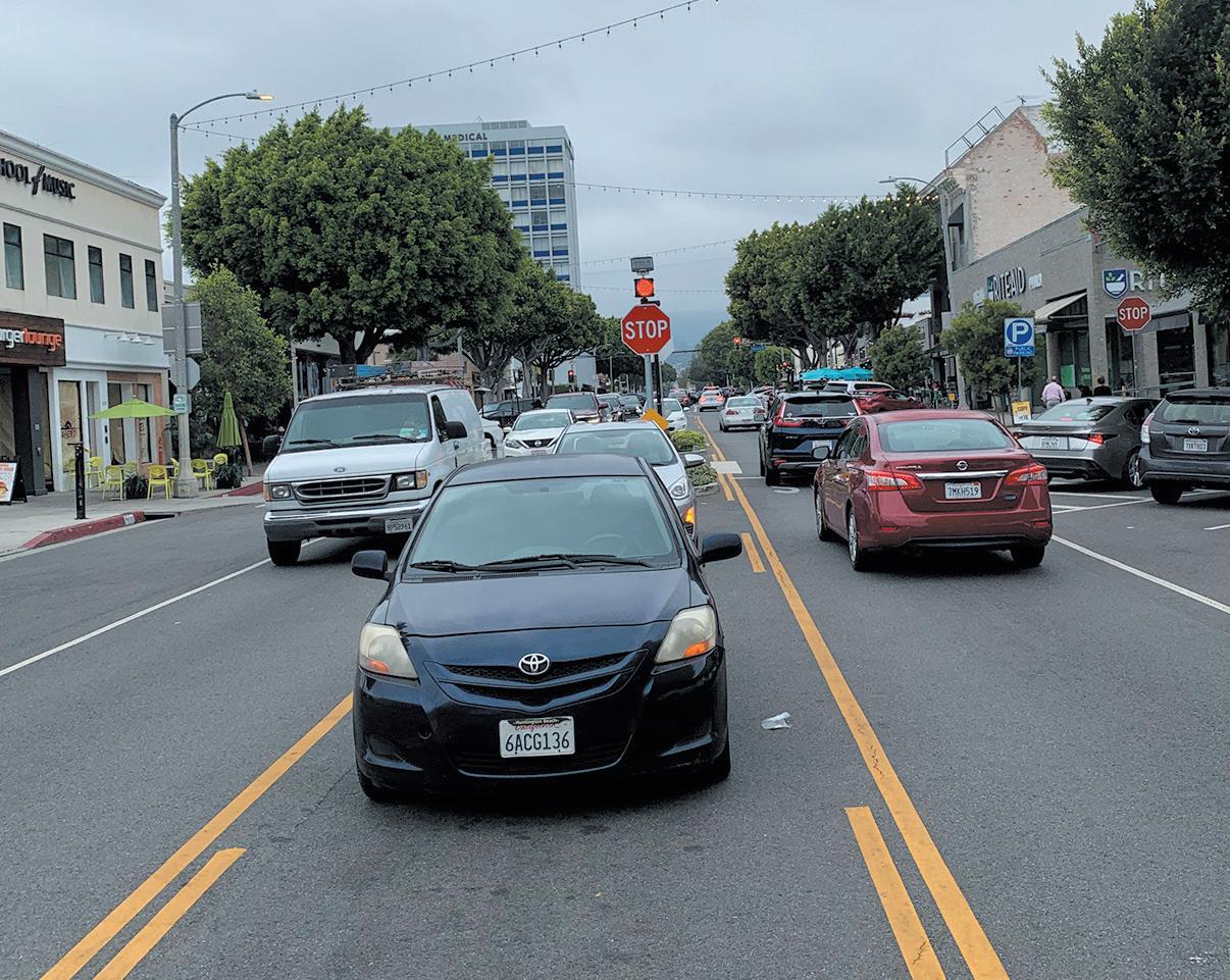 SHOPPERS AND ERRAND-DOERS illegally park in the center lane on Larchmont Boulevard.