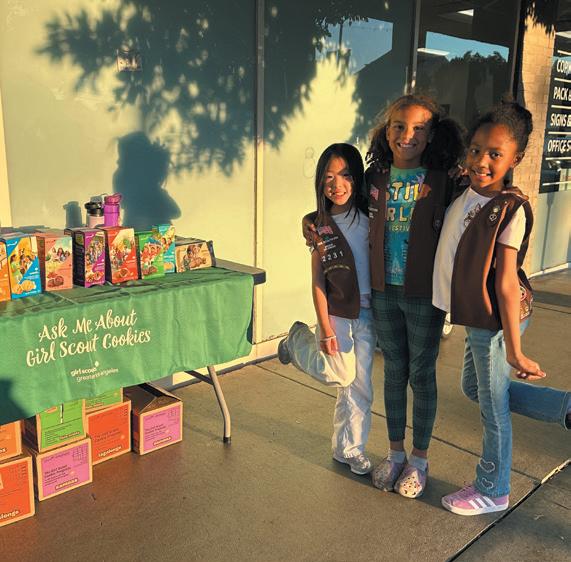GIRL SCOUTS selling the last of the cookies on the Boulevard. (From left) Everly Choi, Yara Hamilton, and Monroe Stewart.