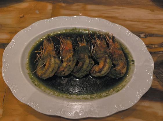 SUCCULENT PRAWNS in green garlic salsa verde.