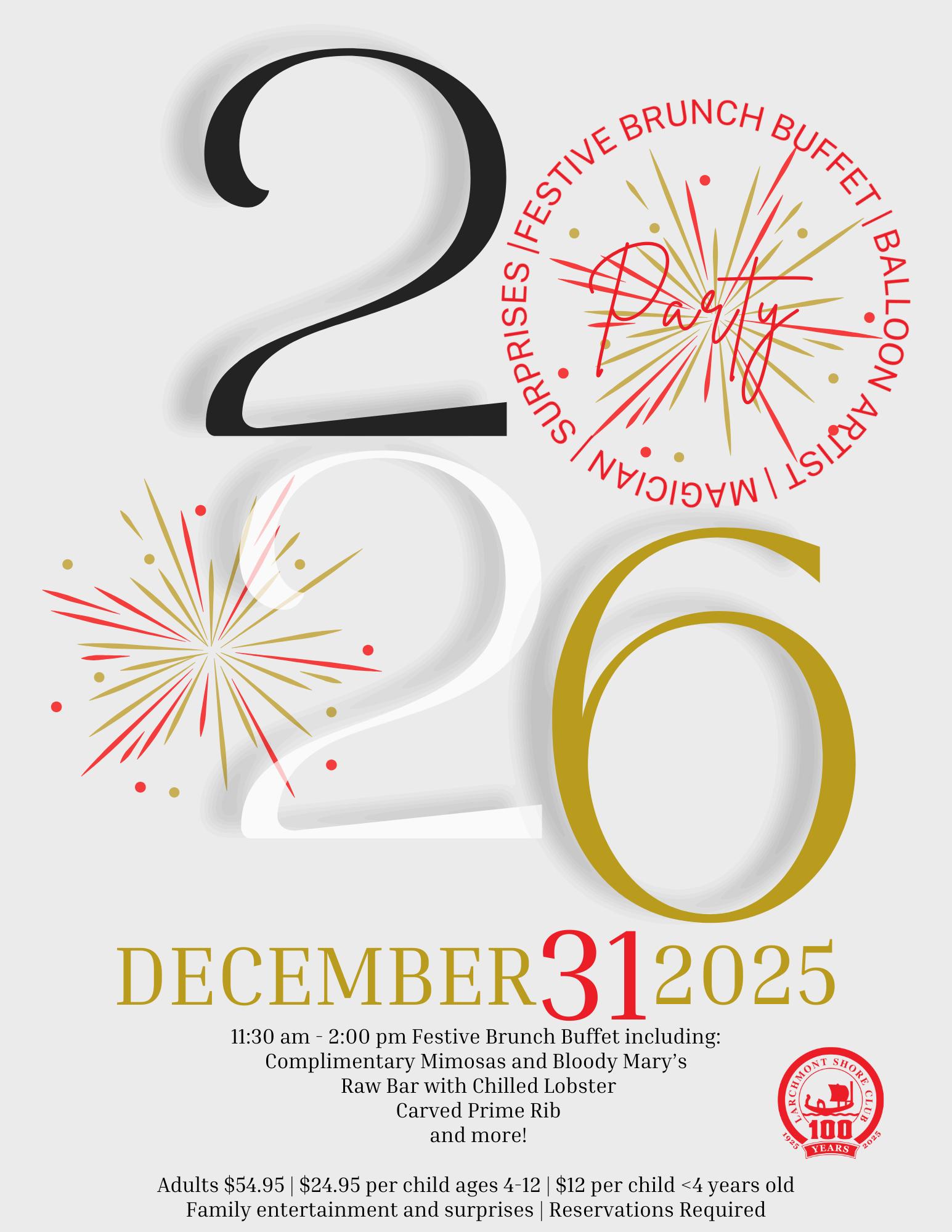 A Larchmont Shore Club tradition Festive Brunch including unlimited Mimosa’s and Bloody Mary’s, Raw Bar with chilled Lobster and Carved Prime Rib. Family entertainment and some surprises! Seatings every 30 minutes beginning at 11:30 am through 2:00 pm