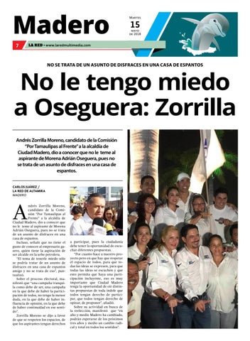 No le tengo miedo a Oseguera: Zorrilla Andrés Zorrilla Moreno, candidato de la Comisión “Por Tamaulipas al Frente” a la alcaldía de Ciudad Madero, dio a conocer que no le teme al aspirante de Morena Adrián Oseguera, pues no se trata de un asunto de disfraces en una casa de espantos. Carlos Juárez / LA RED DE ALTAMIRA MADERO