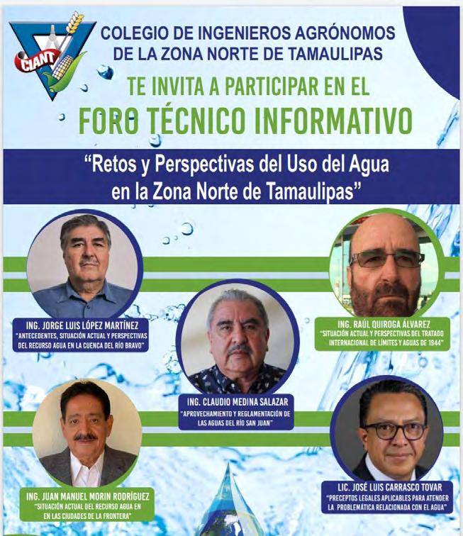 “Retos y perspectivas del uso del agua” será el foro que habrá de celebrarse el próxi mo 6 de octubre, en el municipio de Río Bra vo, el cual es organizado por el Colegio de Ingenieros Agrónomos del Norte de Tamau lipasUno(CIANT).delos objetivos principales de este encuentro será la de analizar la situación que priva en torno al suministro de agua.