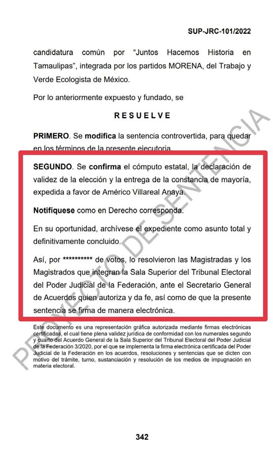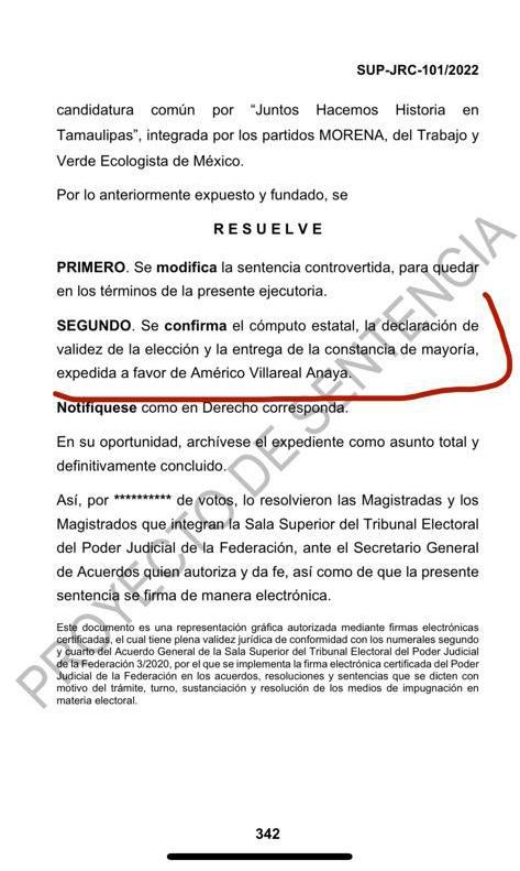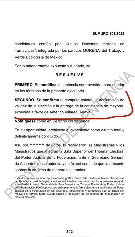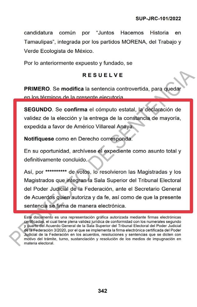nos de la presente ejecutoria, se confir ma el cómputo estatal, la declaración de validez de la elección y la entrega de la constancia de mayoría, expedida a fa vor de Américo Villareal Anaya además que se notifique como Derecho Corres ponda.