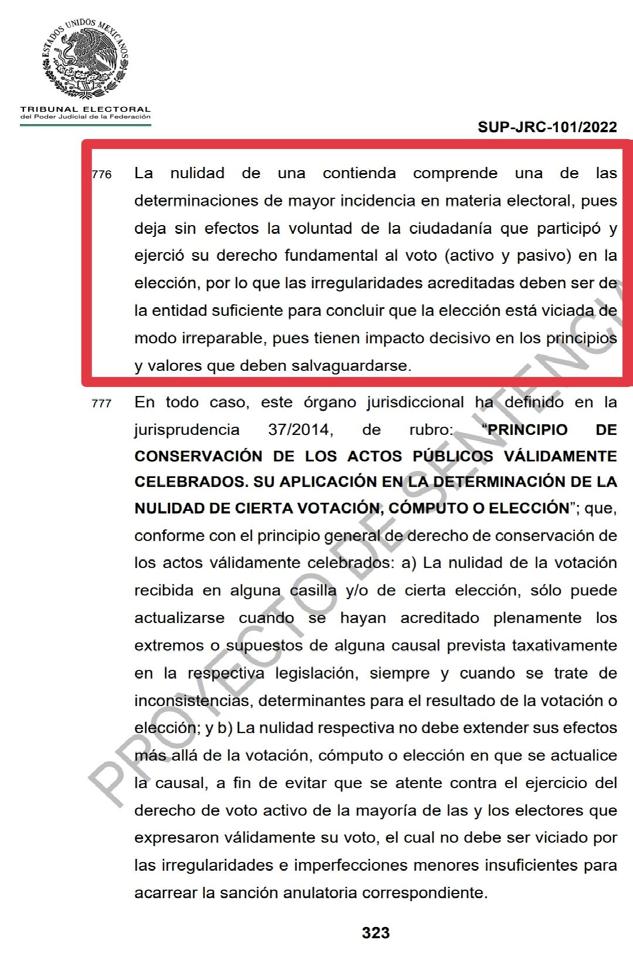 Aunque, también se aclara que el capítulo Noveno, del análisis de condi ciones de validez de la elección que: “La nulidad de una contienda comprende una de las determinaciones de mayor incidencia en materia electoral, pues deja sin efecto la voluntad de la ciuda danía que participó y ejerció su derecho fundamental al voto (activo y pasivo) en la elección, por lo que las irregula ridades acreditadas deben de ser de la entidad suficiente para concluir que la elección está viciada de modo irrepa rable, pues tienen impacto decisivo en los principios y valores que deben salva guardarse”.
