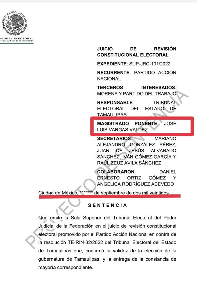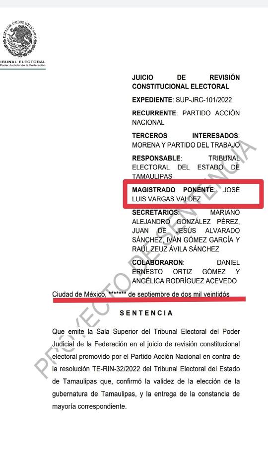 de hacerse público por el Tribunal Electoral del Poder Ju dicial de la Federación (TEPJF) el proyecto de resolución relati vo a la gubernatura de Tamaulipas a pe tición del magistrado ponente José Luis Vargas Valdez, conforme a lineamientos establecidos en acuerdo general del mis mo órgano colegiado, solicito la publi cación del mismo SUP-JRC-101/2022, puesto que al ser quien tuvo la cuenta