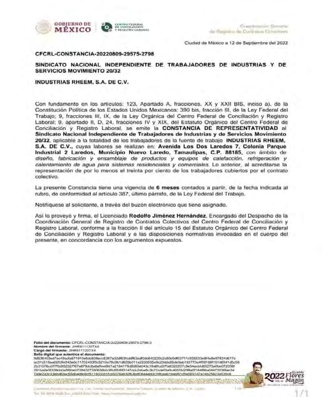 La reforma laboral registró su primer efecto sindical al ser decisión del trabajador el sindicato al que deseen pertenecer, siendo en este caso la plantilla laboral de la empresa Industrias Rheem, S. A. de C. V., la que ahora operará bajo la responsabilidad de defensa de los derechos de los trabajadores del Sindicato Nacional Independiente de Trabajadores de Industria y de Servicios Movimiento 20/32.