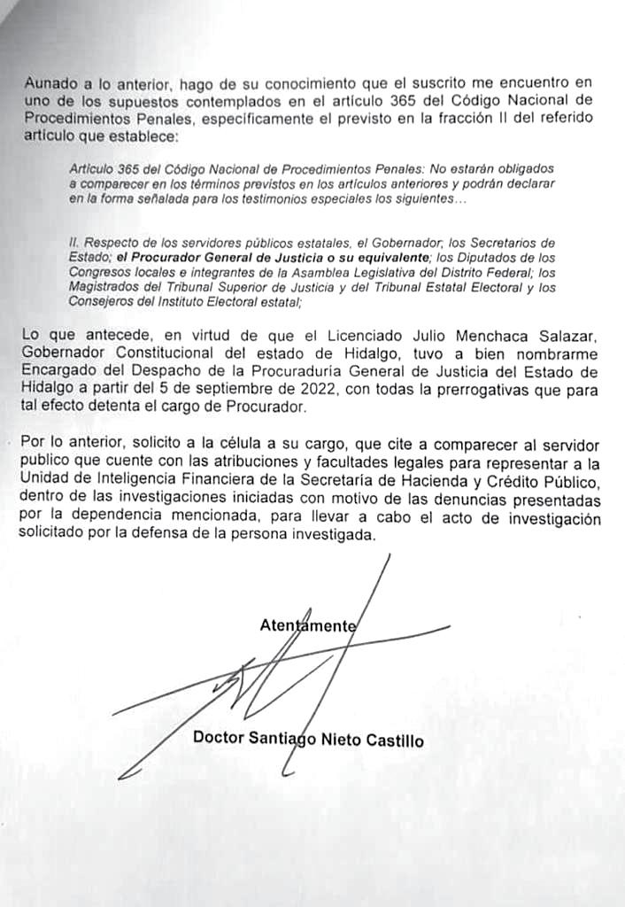 “Si la Fiscalía Especializada considera necesaria la amplia ción de la denuncia presentada por el titular de la UIF de la Se cretaría de Hacienda y Crédito Público, esta tendrá que ser a través del servidor público que actualmente cuenta con las fa cultades y atribuciones legales para representar dicha Unidad”, dice en el oficio de respuesta a la Fiscalía, Nieto Castillo.