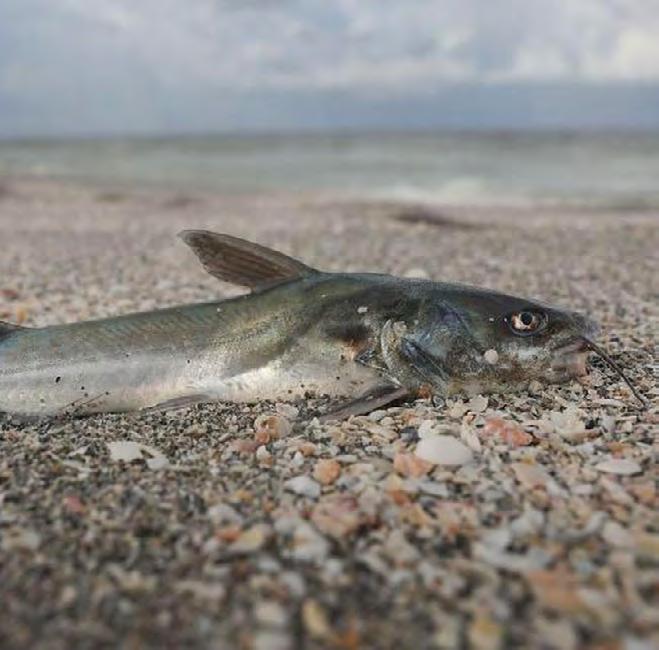 Cabe destacar que también se regis tró mortandad de peces en Playa Teso ro lo cual se debe a la presencia de la marea roja, conformada por una con centración de algas tipo dinoflagelados, las cuales causan molestias a todo ser vivo y en el caso de los seres humanos irritación de garganta, por lo que se decidió cerrar el acceso al público en general desde el pasado fin de semana.