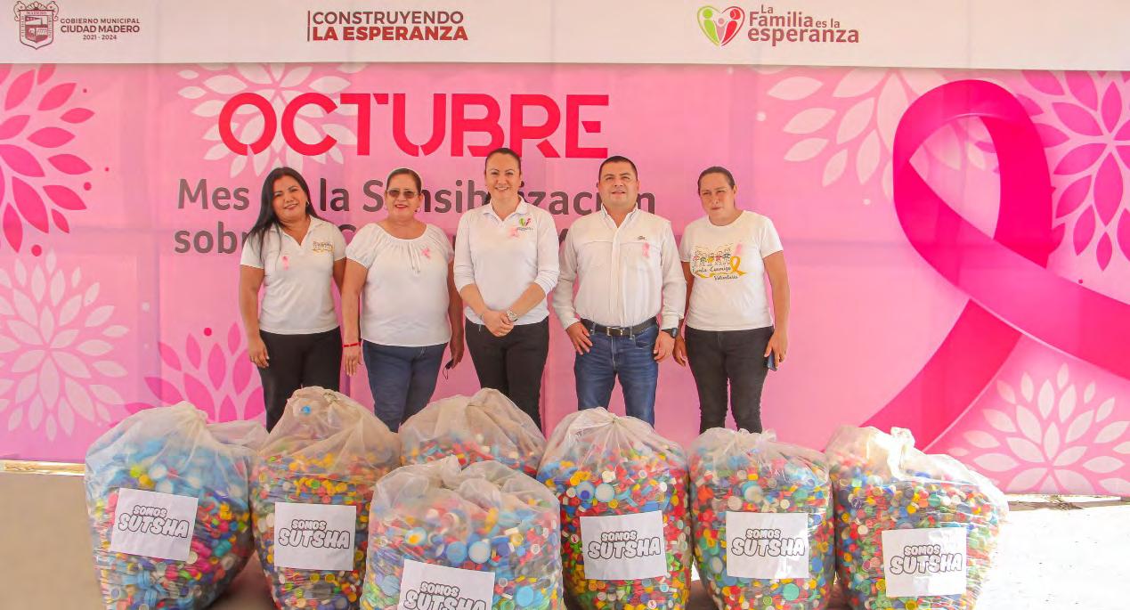 Para reforzar la lucha contra el cáncer, el sistema DIF de Ciudad Madero que preside la Sra. Ana Cristina Organista de Oseguera, recibió la donación de tapitas de plástico por parte del Sindicato Único de Trabajadores al Servicio del H. Ayuntamiento de Ciudad Madero (SUTSHA) para ser cambiadas por tratamientos médicos para personas con esta enfermedad.