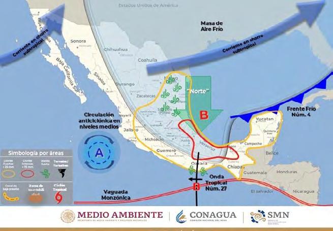 Por otra parte, la onda tropical número 27 reco rrerá el sureste del país, en combinación con el ingreso de humedad del Golfo de México y Mar caribe, pro vocarán lluvias fuertes a muy fuertes en dicha región, con lluvias puntuales intensas en Veracruz y oaxaca, además de chubascos en la Península de Yucatán.