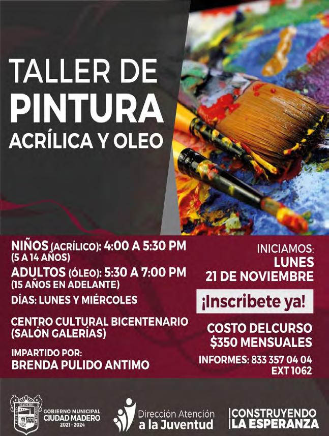 La Dirección de Atención a la Ju ventud de Ciudad Madero, invita a niños y jóvenes a participar en el Taller de Pintura Acrílica que se lle vará a cabo a partir del próximo 21 de noviembre en el Centro Cultural Bicentenario.