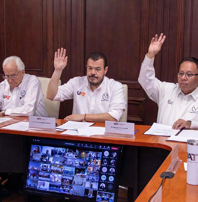La reunión se desarrolló de manera virtual en la Sala de Juntas de la rectoría, y fue presidida por el rector C. P. Guillermo Mendoza Cavazos, quien estuvo acompañado por el Dr. Eduardo Arvizu Sánchez, secretario general, así como por el C. P. Luis Navarro Roso, decano de la UAT.