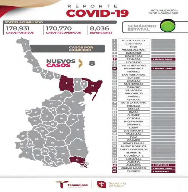 El secretario de Salud, Vicente Joel Hernández Navarro, informó que duran te la jornada de este viernes se confirma ron 8 nuevos casos de COVID-19 y sin registrase defunciones asociadas a esta enfermedad.