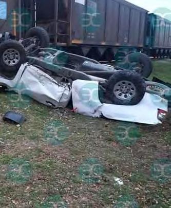 En forma impresionante una camioneta terminó volcada y quedó prácticamente destrozada después de ser impactada por el tren, cuando el conductor aparen temente trato de ganarle el paso.