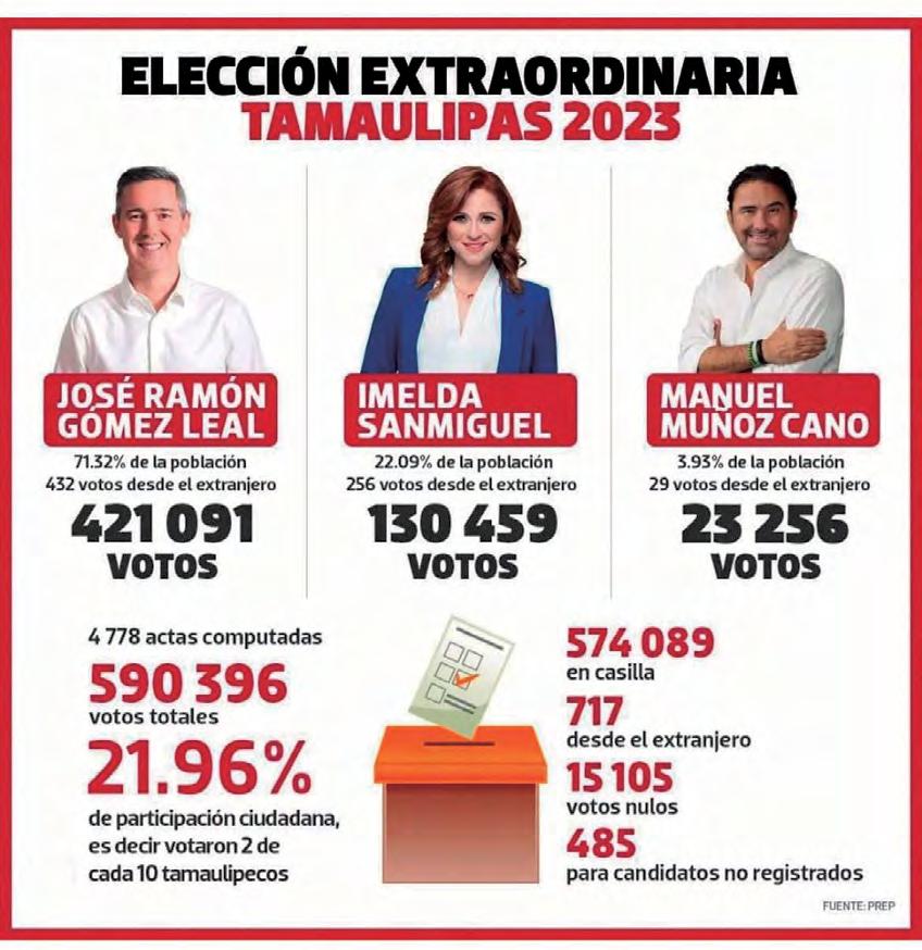 Luego de la elección del 19 de febrero en Tamaulipas, José Ramón Gómez Leal, candidato de Morena y PT, es el virtual ganador al tener el 100 por ciento de las actas capturadas en el PREP, por lo que cubrirá la vacante de senador.