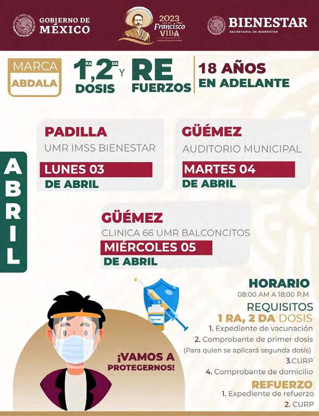 La calendarización de esta semana para la aplicación de la vacuna contra el Covid, dará inicio este domingo 2 de abril en el municipio de aldama, el lunes 3 en Padilla, Llera y Tampico, y para el martes 4 y miércoles 5 de abril en los municipios de Güémez y Tampico.