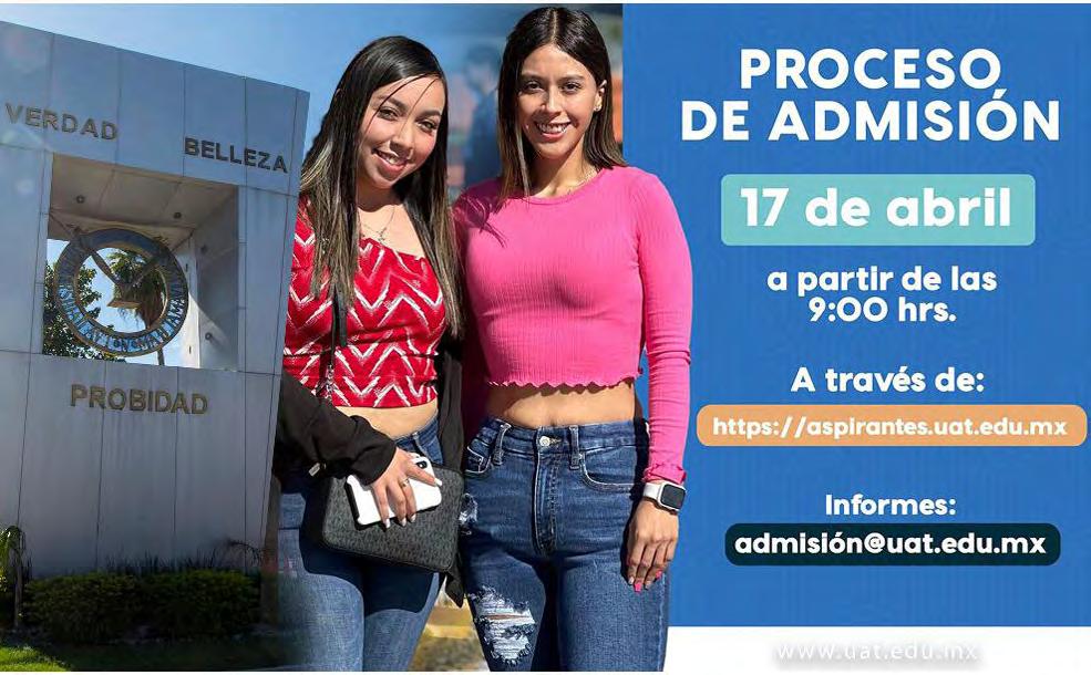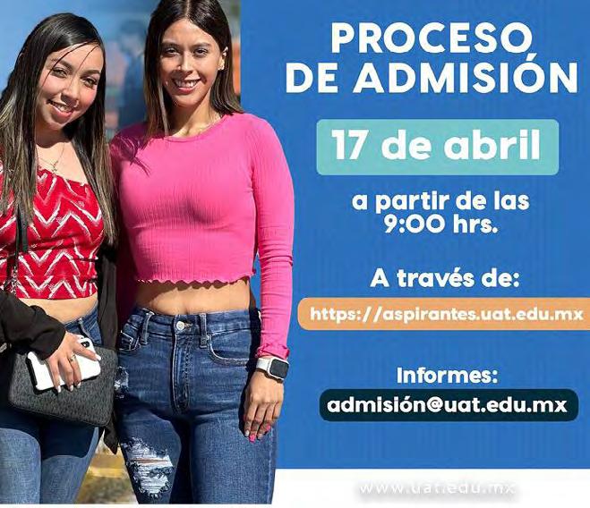 La información de las carreras que se imparten se puede consultar mediante el ingreso al portal oficial www.uat.edu.mx e ir al apartado de “Oferta Académica”; en tanto que el registro de aspirantes al proceso de admisión estará abierto en el sitio web https://registroaspirantes.uat.edu.mx/ con acceso a través del portal oficial de la Universidad.