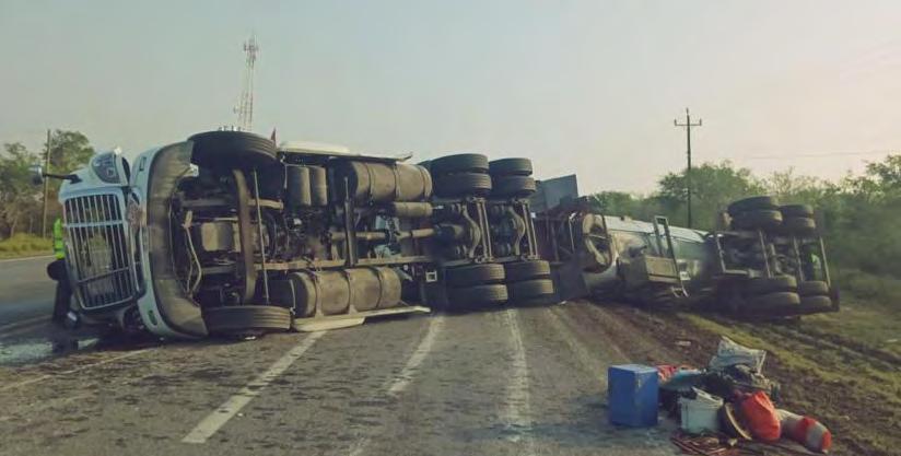 Este domingo a la altura del km 133 de la carretera Victoria-San Fernando se volcó una pipa cargada de resina.