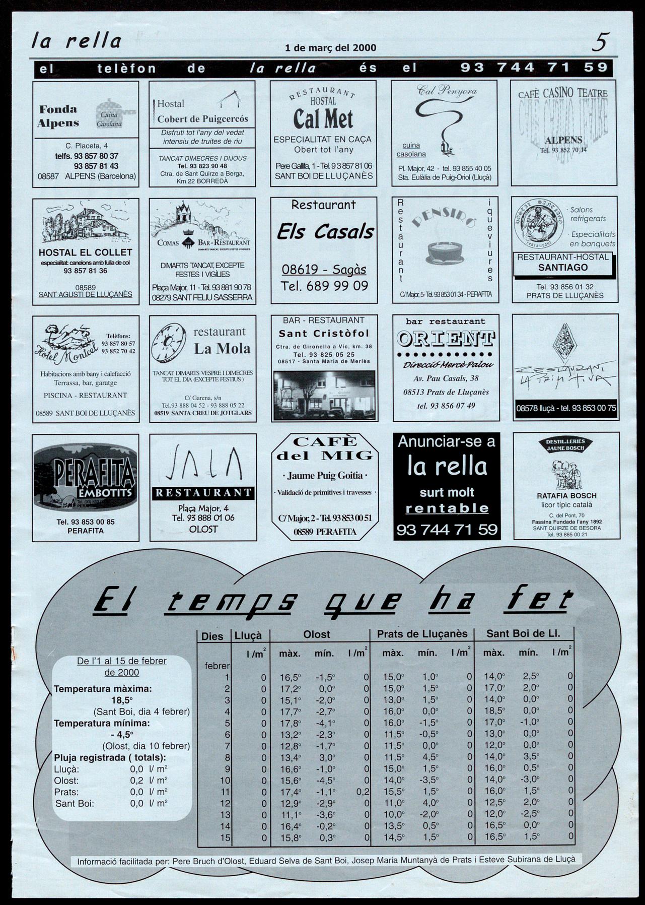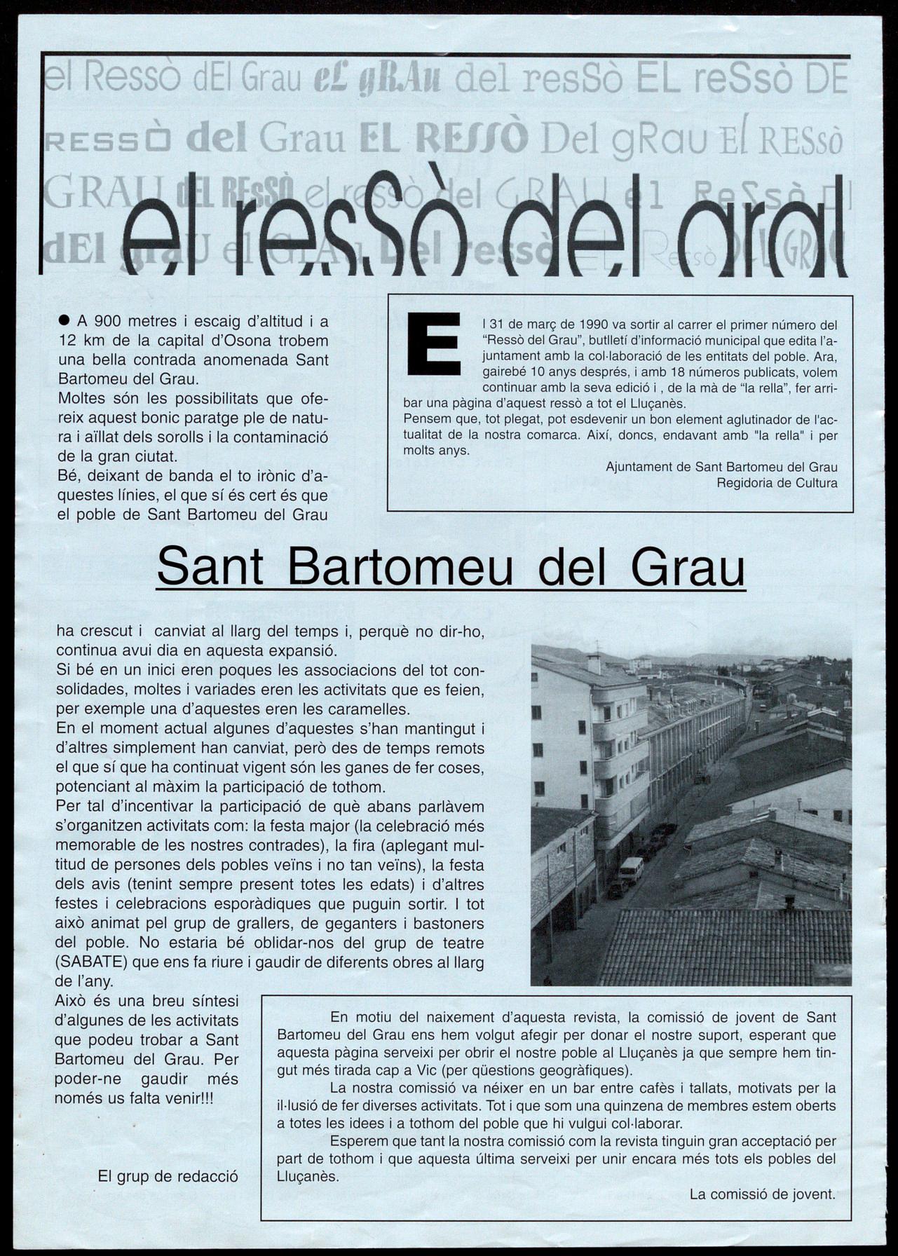 E131 de març de 1990 va sortir al carrer el primer número del "Ressò del Grau", butlletí d'informació municipal que edita l'ajuntament amb la collaboració de les entitats del poble. Ara, gairebé 10 anys després, amb 18 números publicats, volem continuar amb la seva edició de la mà de "la rella", fer arribar una pàgina d'aquest ressò a tot el Lluçanès.