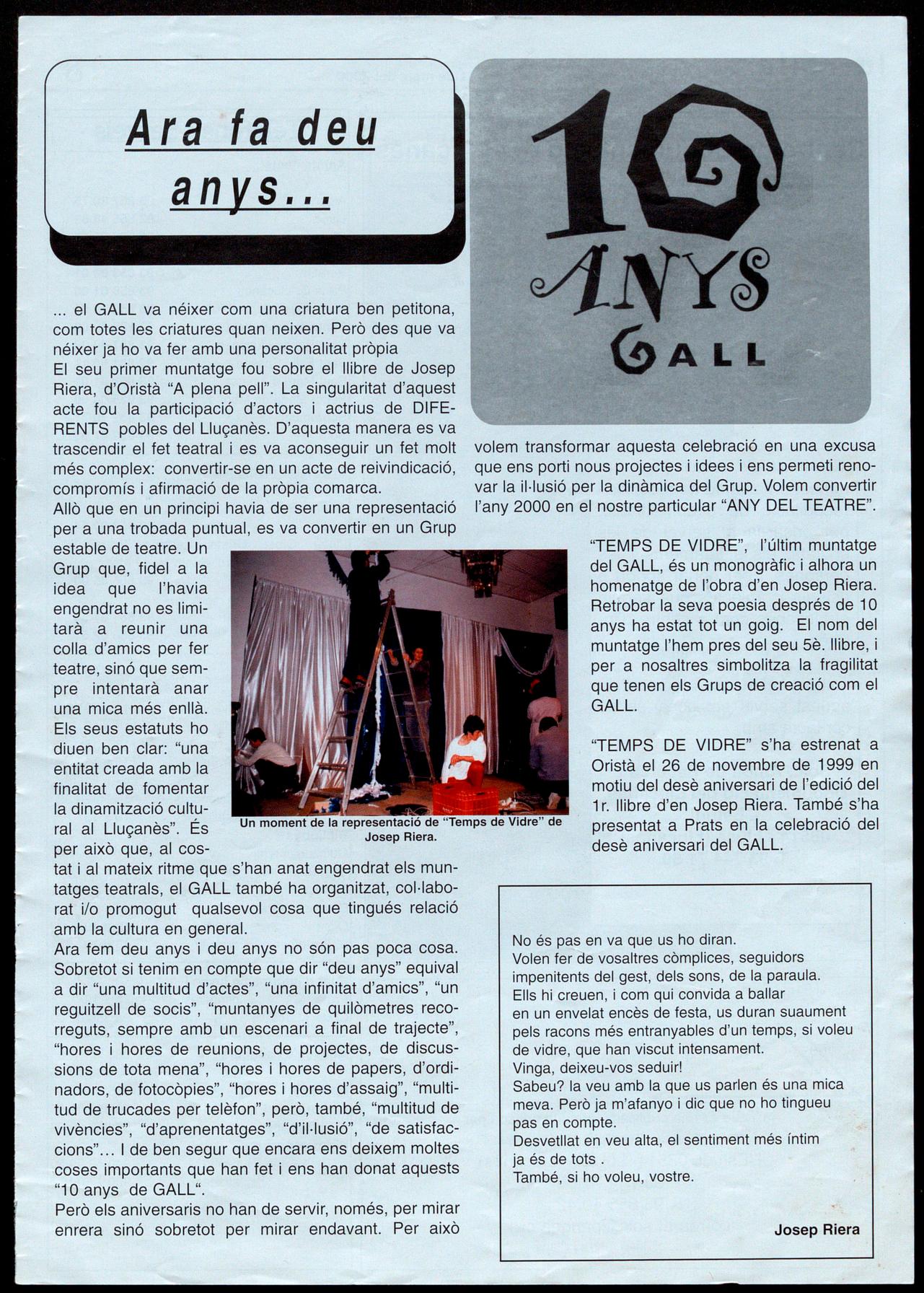 "TEMPS DE VIDRE", l'últim muntatge del GALL, és un monogràfic alhora un homenatge de l'obra d'en Josep Riera. Retrobar la seva poesia després de 10 anys ha estat tot un goig. El nom del muntatge l'hem pres del seu 5è. llibre, i per a nosaltres simbolitza la fragilitat que tenen els Grups de creació com el GALL.