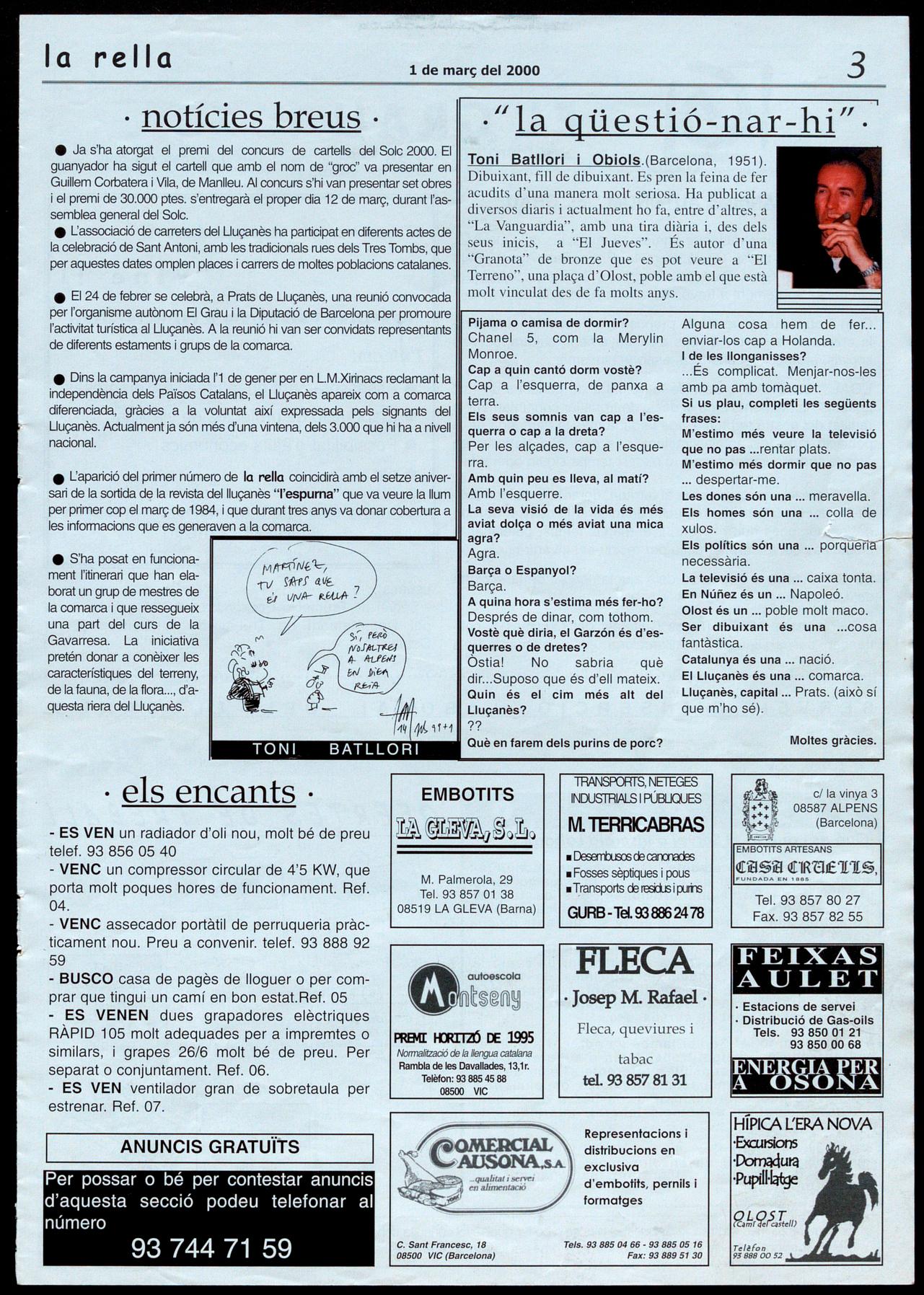 Per possar o bé per contestar anuncis d'aquesta secció podeu telefonar al número