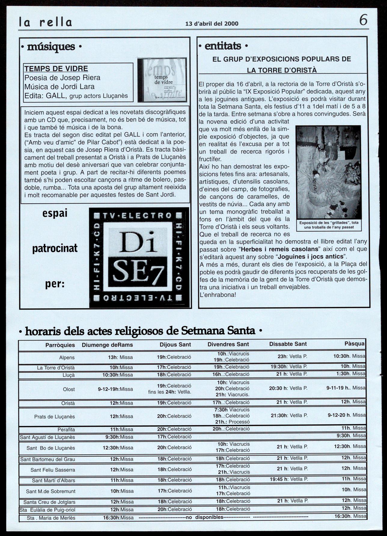 La Torre d'Oristà . A les 5 de la tarda, a la rectoria, inauguració de la IX Exposició Popular, "Joguines antigues", i presentació del llibre "Jocs i joguines antigues". (Veure horaris de l'exposició en article a part).