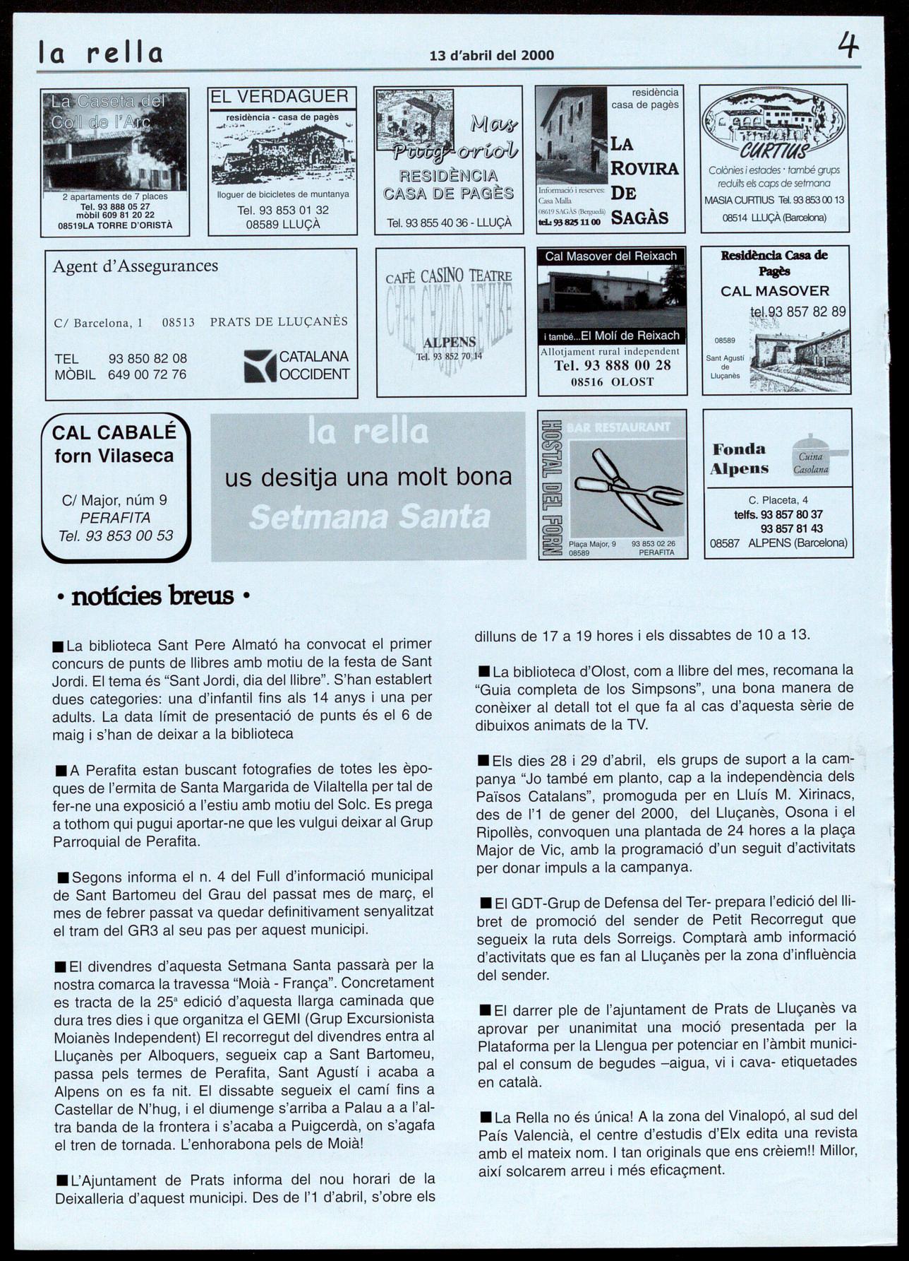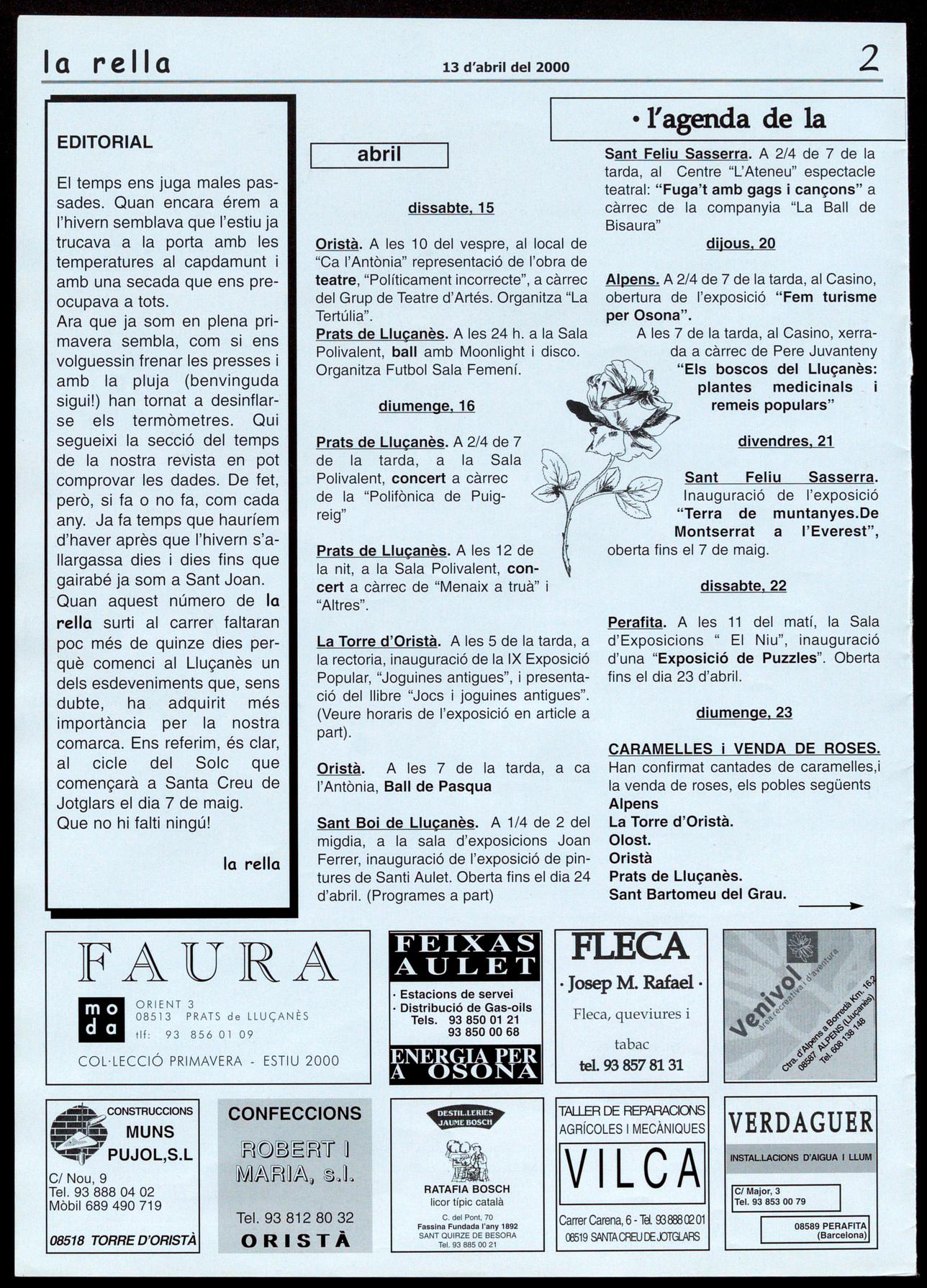 El temps ens juga males passades. Quan encara érem a l'hivern semblava que l'estiu ja trucava a la porta amb les temperatures al capdamunt amb una secada que ens preocupava a tots. Ara que ja som en plena primavera sembla, com si ens volguessin frenar les presses amb la pluja (benvinguda sigui!) han tornat a desinflarse els termòmetres. Qui segueixi la secció del temps de la nostra revista en pot comprovar les dades. De fet, però, si fa o no fa, com cada any. Ja fa temps que haurÃem d'haver après que l'hivern s'allargassa dies dies fins que gairabé ja som a Sant Joan. Quan aquest número de la rella surti al carrer faltaran poc més de quinze dies perquè comenci al Lluçanès un dels esdeveniments que, sens dubte, ha. adquirit més importà ncia per la nostra comarca. Ens referim, és clar, al cicle del Solc que començarà a Santa Creu de Jotglars el dia 7 de maig. Que no hi falti ningú!