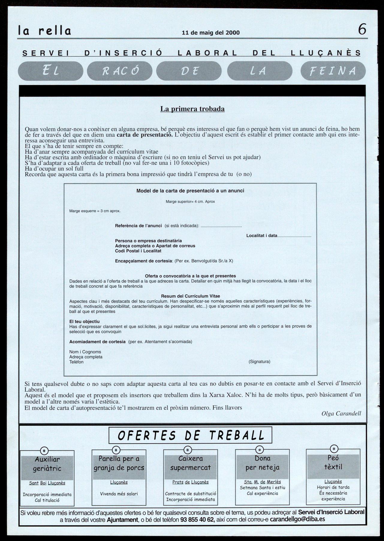 Aquest és el model que et proposem els insertors que treballem dins la Xarxa Xaloc. N'hi ha de molts tipus, però bàsicament d'un model a l'altre només varia l'estètica. El model de carta d'autopresentació te'l mostrarem en el pròxim número. Fins llavors
