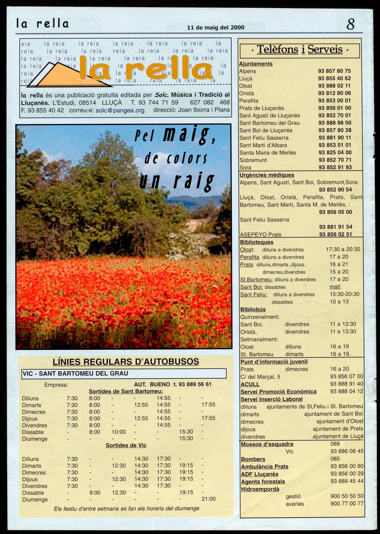dilluns ajuntaments de St,Feliu St. Bartomeu dimarts ajuntament de Sant Boi dimecres ajuntament d'Olost dijous ajuntament de Prats divendres .ajuntament de Lluçà Mossos d'esguadra 088 Vic 938860845 Bombers 085