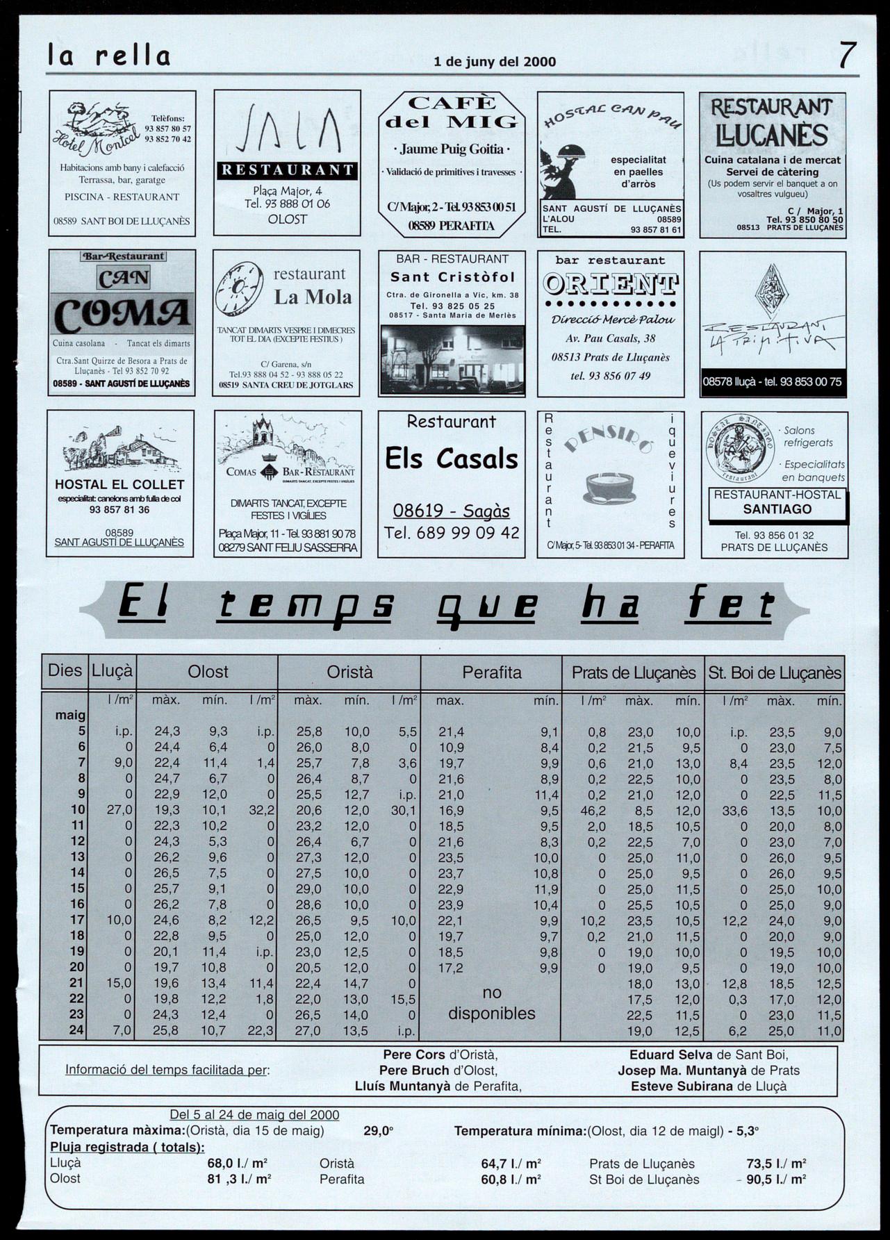 Sant Feliu Sasserra - Solc 2000: A les 8 del matí, sortida de la "Ruta de les Bruixes", caminada pels contorns del poble. A les 5 de la tarda presentació del llibre "Un segle de vida al Lluçanès: Memòries de la Pepa Grilló" escrita per Dolors Soler. Presentarà Ramon Barnils. A la tarda, 2a. Trobada de gegants del Lluçanès