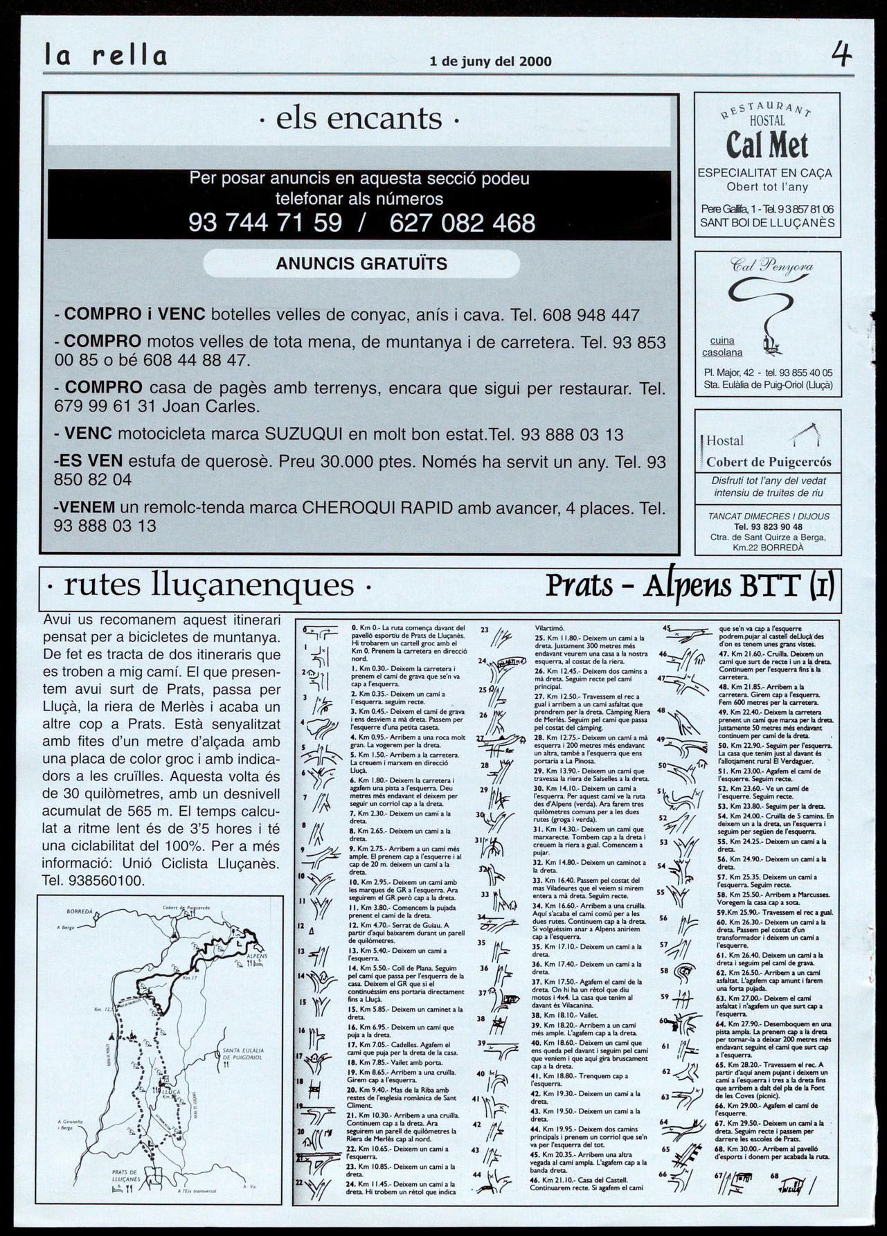 Avui us recomanem aquest itinerari pensat per a bicicletes de muntanya, De fet es tracta de dos itineraris que es troben a mig camí. El que presentem avui surt de Prats, passa per Lluçà, la riera de Merlès acaba un altre cop a Prats, Està senyalitzat amb fites d'un metre d'alçada amb una placa de color groc amb indicadors a les cruïlles, Aquesta volta és de 30 quilòmetres, amb un desnivell acumulat de 565 m. El temps calculat a ritme lent és de 3'5 hores i té una ciclabilitat del 100%. Per a més informació: Unió Ciclista Lluçanès. Tel. 938560100,