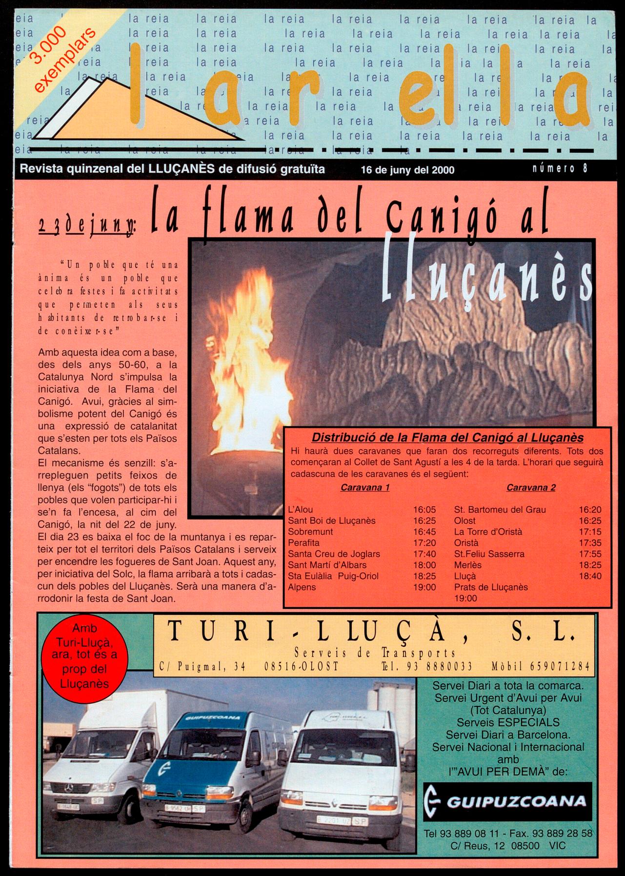 Solc 2000. Baixada de la Flama del Canigó i distribució de la Flama del Manifest de la Diada Nacional dels Països Catalans a cada poble del Lluçanès. Consulteu els horaris als respectius Ajuntaments. Revetlles de Sant Joan dissabte. 24