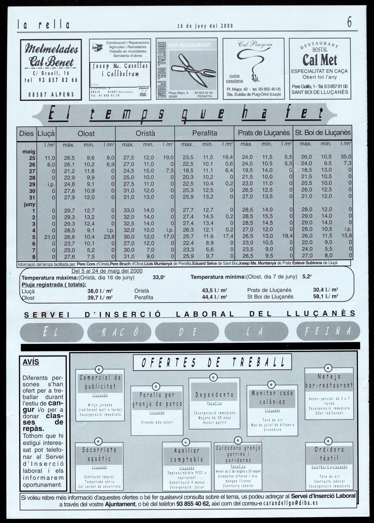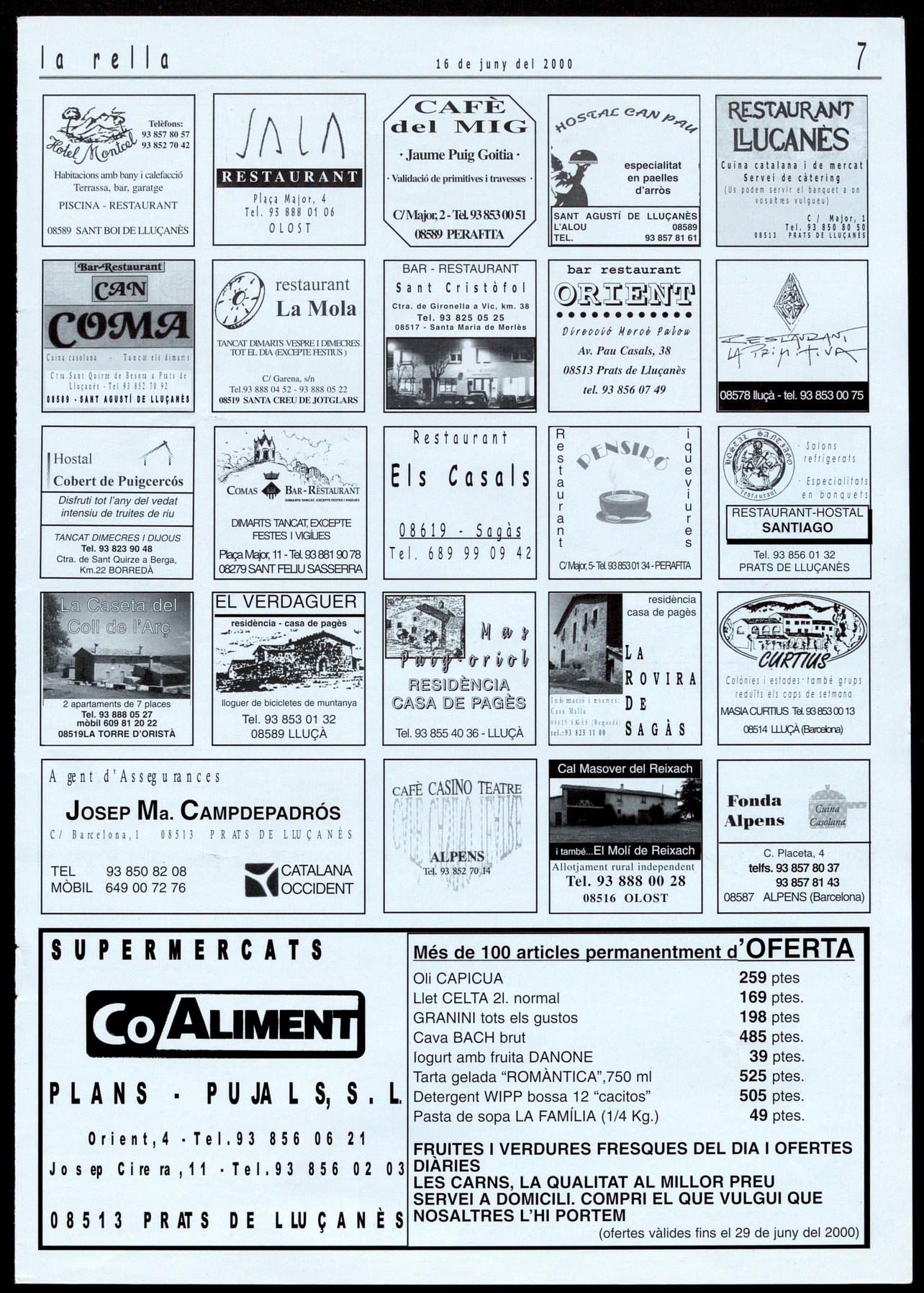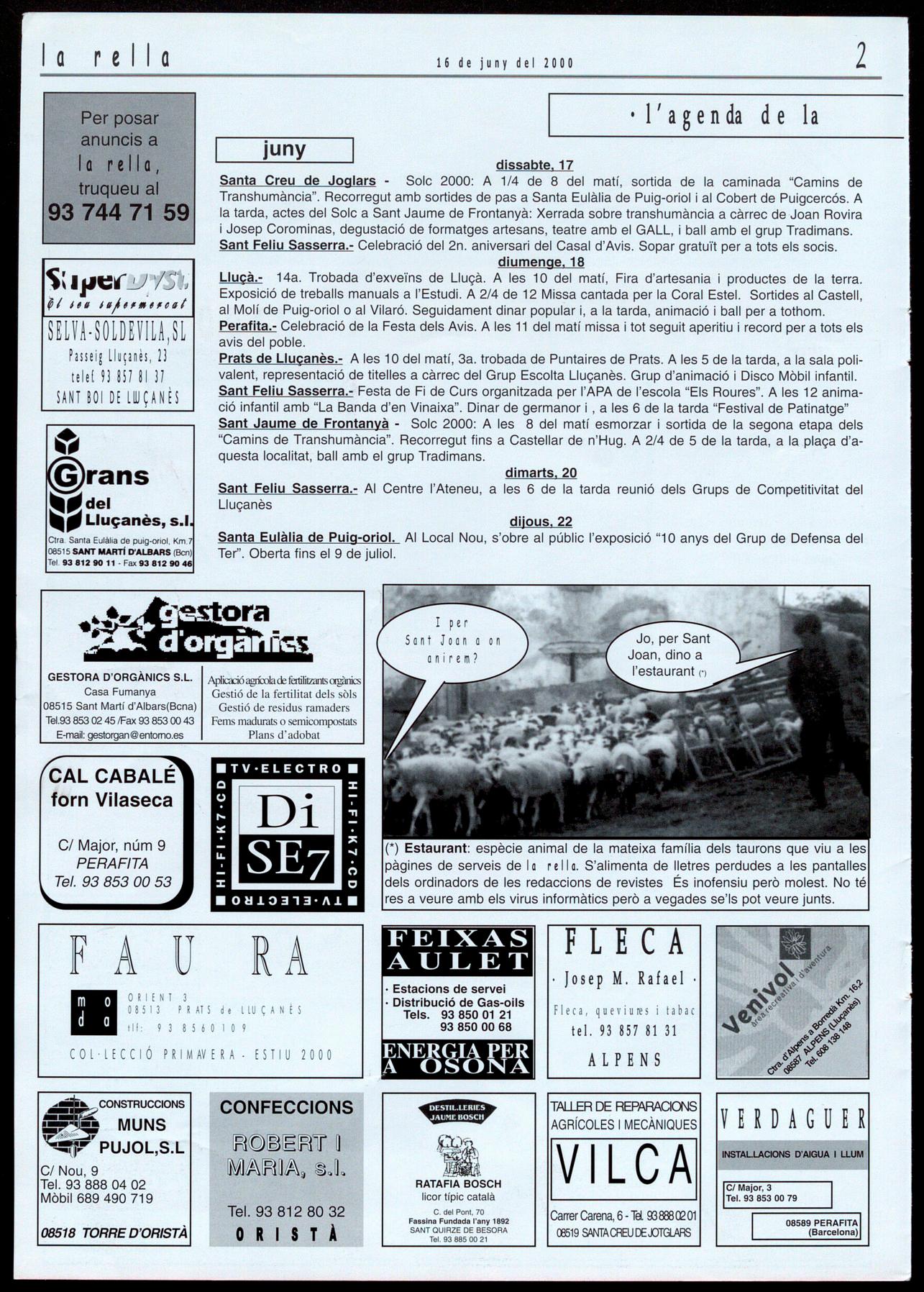 Santa Eulàlia de Puig-oriol. Festa del Medi Ambient. AI matí presentació del "Itinerari de Natura per la Riera Gavarresa". Es sortirà a 2/4 de 1 O del matí de la Plaça de Santa Eulàlia es farà el recorregut amb tothom qui ho desitgi. A mig Itinerari es farà la presentació a càrrec de Xavier Manubens.A la tarda inauguració oficial de l'exposició "10 anys del Grup de Defensa del Ter", al Local Nou. La Torre d'Oristà - Solc 2000: A les 8 del matí, presentació del número 3 de la revista CARAMELLA. A les 9 de la nit, sopar popular a la plaça. A les 10 de la nit, actuació de cantadors i cantadores. A 2/4 de 12 de la nit, concert ball amb el grup El Pont d'Arcalís. Oristà. A les 10 de la nit, a Ca I' Antònia, fi de temporada dels balls de "La Tertúlia". Ball amb Manel López. L'entrada inclou un entrepà de botifarra. diumenge.2 Alpens. Aplec de Sant Pere de Serrallonga trobada d'exveïns. A les 12 del migdia missa solemne. A la 1, rebuda oficial dels exveïns. A les 2, dinar de germanor. A la tarda fi de festa amb l'acordionista Francesc Clotet. Cal apuntar-se al telèfon 93 957 80 75. Entreteniments per a la mainada servei de bar.